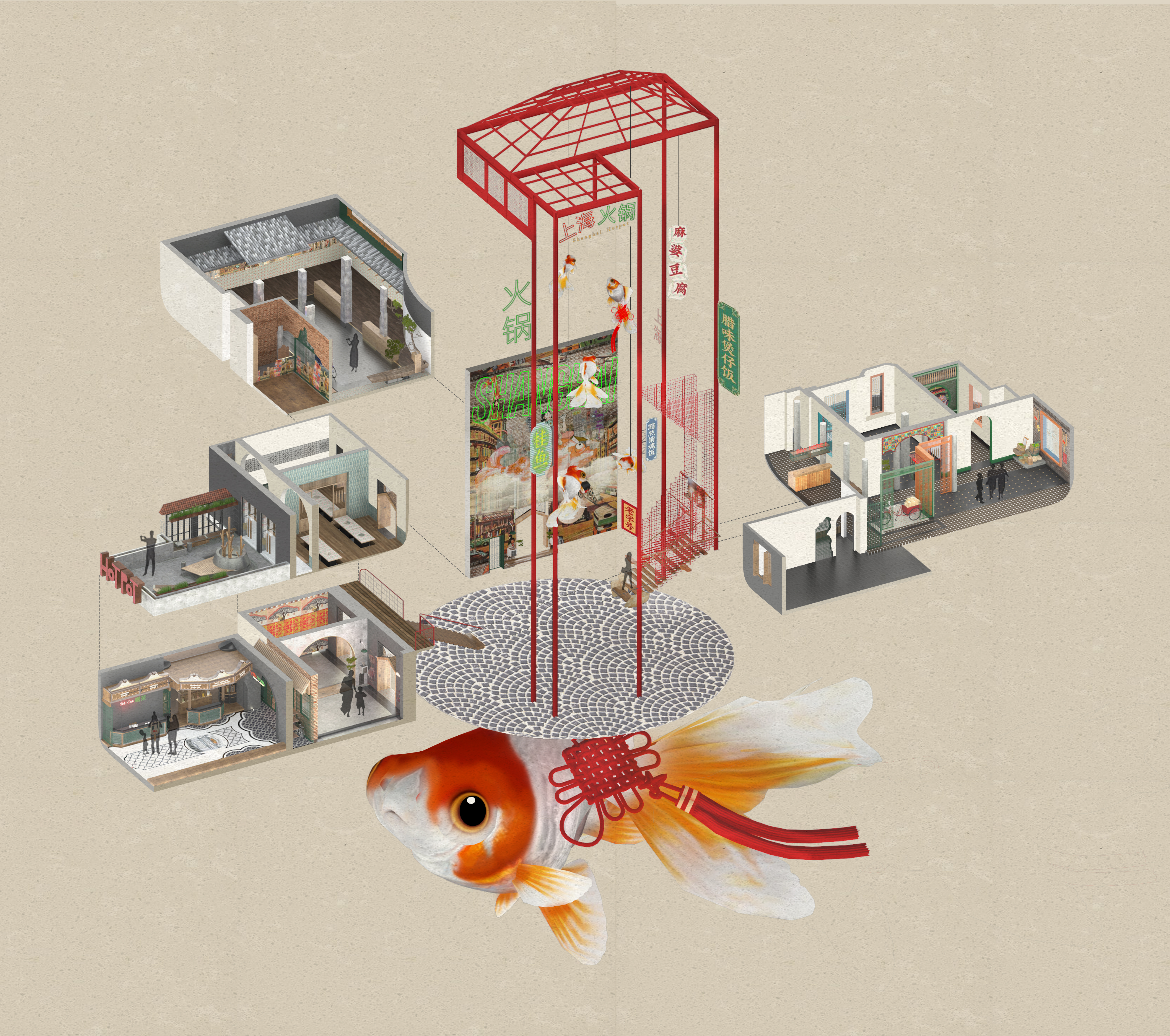 Nằm trên tuyến phố khá yên tĩnh của Hà Nội, điểm cộng sâu sắc của công trình là cách phân chia cấu trúc các tầng dựa trên sự bố trí sẵn có của ngôi nhà cũ, nhưng sự ngẫu nhiên ở đây hết sức thú vị bởi nó đúng với tinh thần nhộn nhịp của Thượng Hải phố. Những dãy nhà cao thấp chen chúc nhau một cách có trật tự, toàn bộ không gian khai thác theo phương thẳng đứng kéo thực khách đi từ không gian nhỏ đến không gian lớn, từ sự ngạc nhiên này đến ngạc nhiên khác.