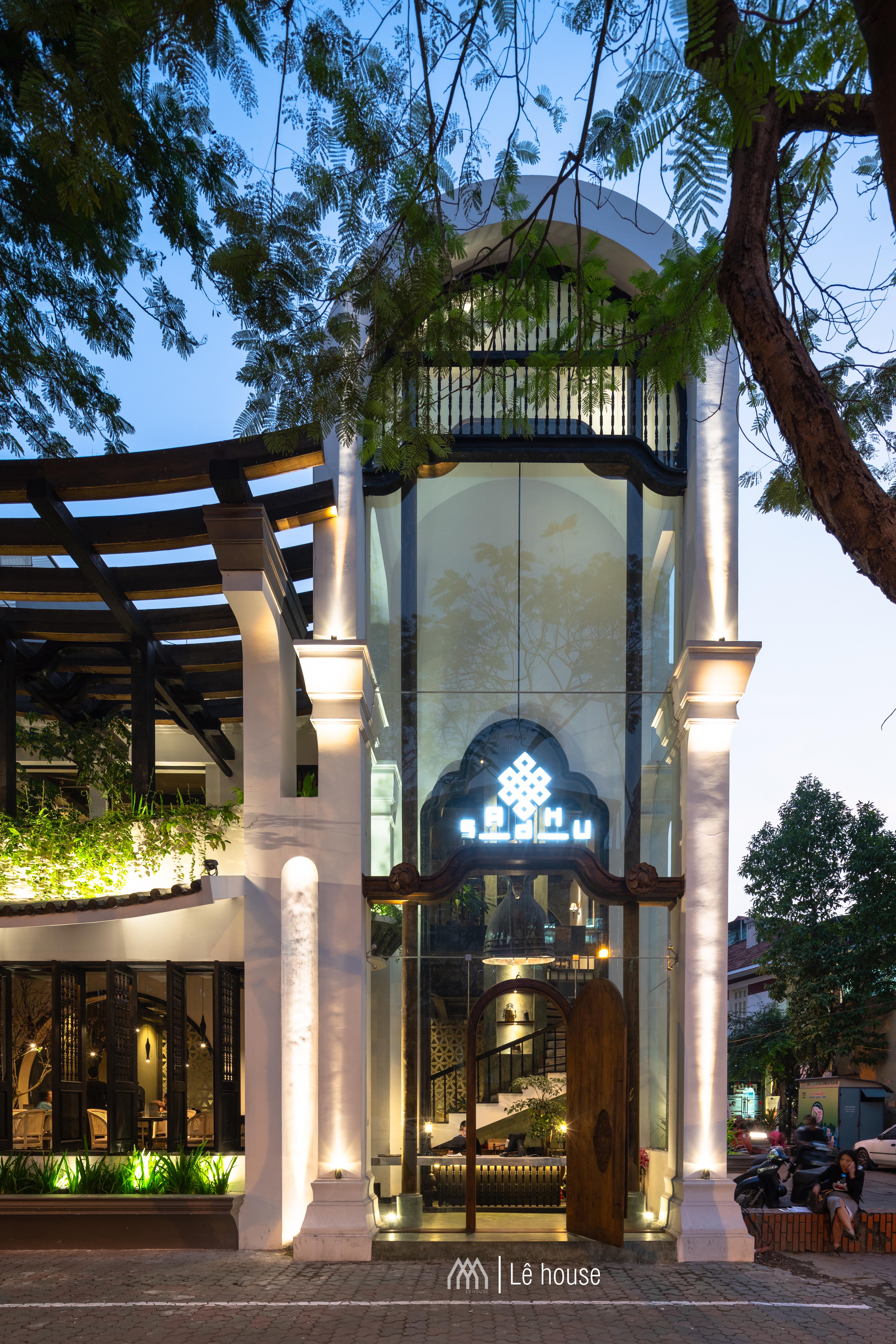 -Không gian được chia làm 2 tầng, mặt tiền được trải dài nhằm khai thác triệt để lối kiến trúc cổ, kết hợp hệ Lam và mái ngói tạo cho cảm giác tái hiện lại dãy phố xưa từng lớp mái nhấp nhô cao thấp. Hệ cửa gỗ mở xoay với từng con Triện nhỏ nằm ẩn mình dưới đám mái ngòi cong vút. Sảnh vào với khoảng thông tầng cao 12 mét là chiếc chuông đồng cổ trang trí lạ mắt, và nổi bật nhất chính là bức tượng Phật Mây lần đầu tiên chúng tôi thử nghiệm in với công nghệ in 3D thay vì thực hiện nó theo phương pháp làm Mây thủ công truyền thống, bức Tượng cũng chính là linh hồn của công trình, treo lững lờ một cách nhẹ nhàng giữa không gian trung tâm của ngôi nhà.Bức tượng Phật Mây độc đáo này đã tốn hết 2,160h để lên thiết kế 3D và thực hiện mô hình tỉ lệ 1:1, và cũng vì điều đặc biệt đó mà nó trở nên nổi tiếng cho mọi người khi đến đây.