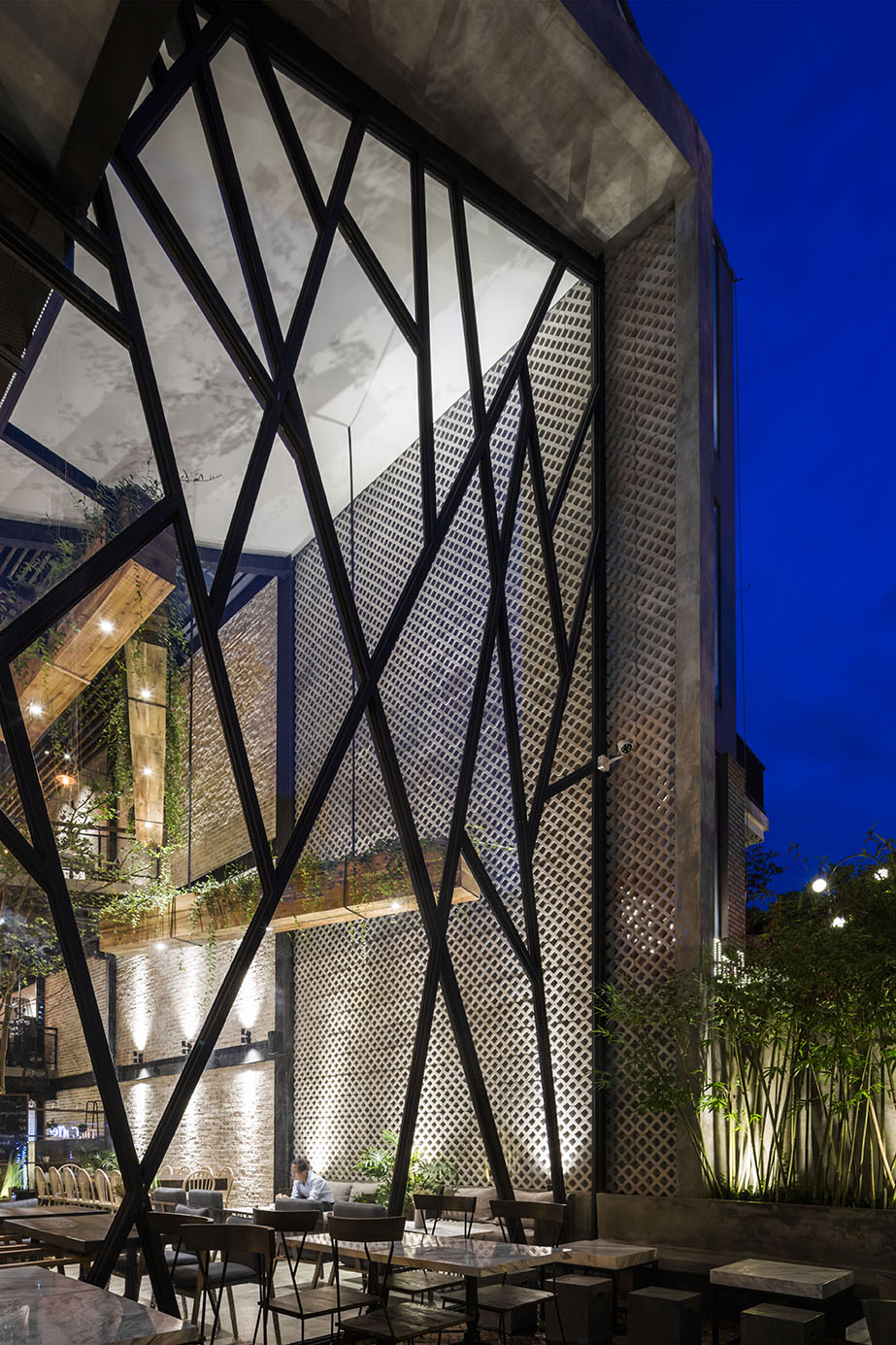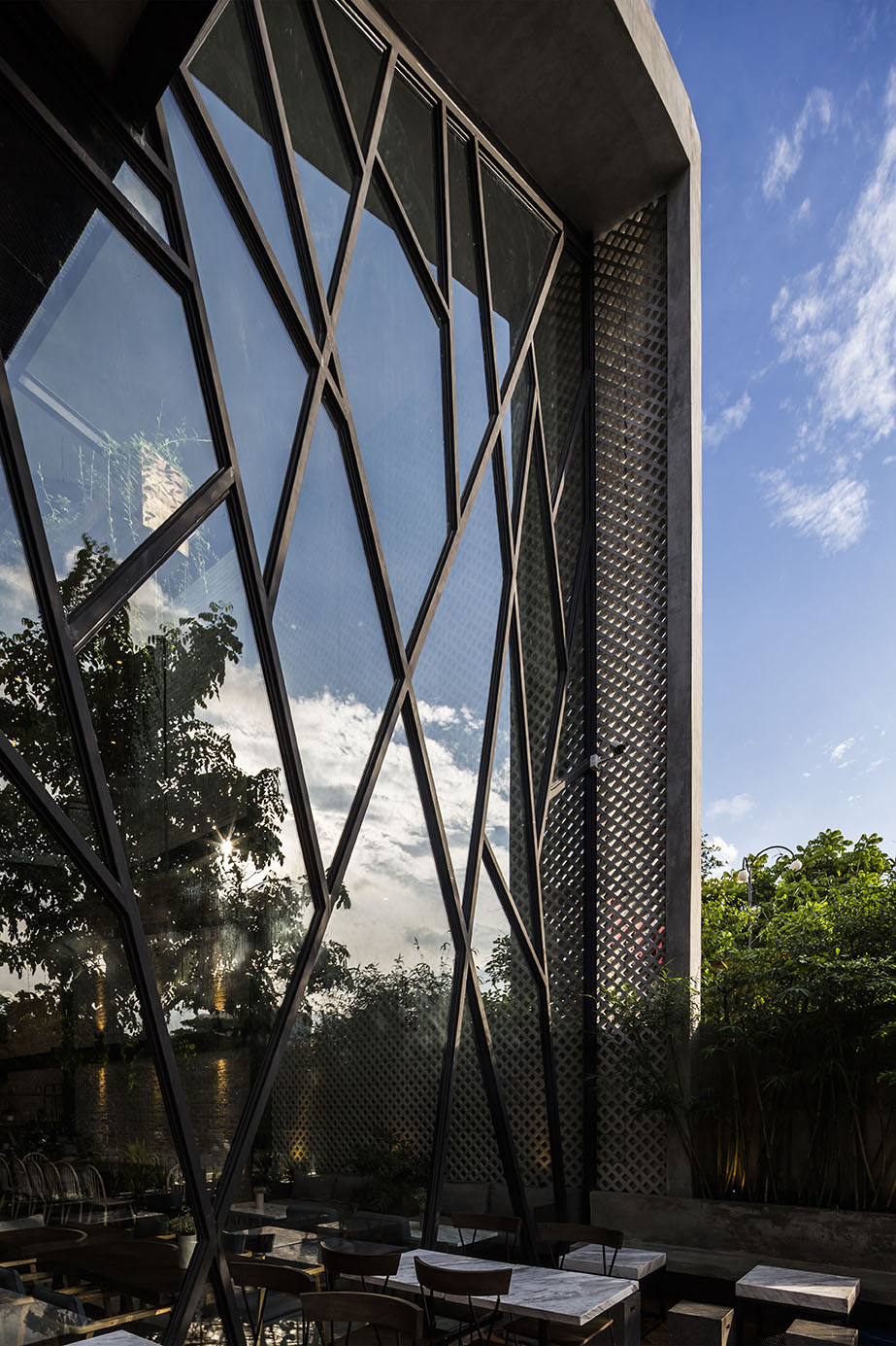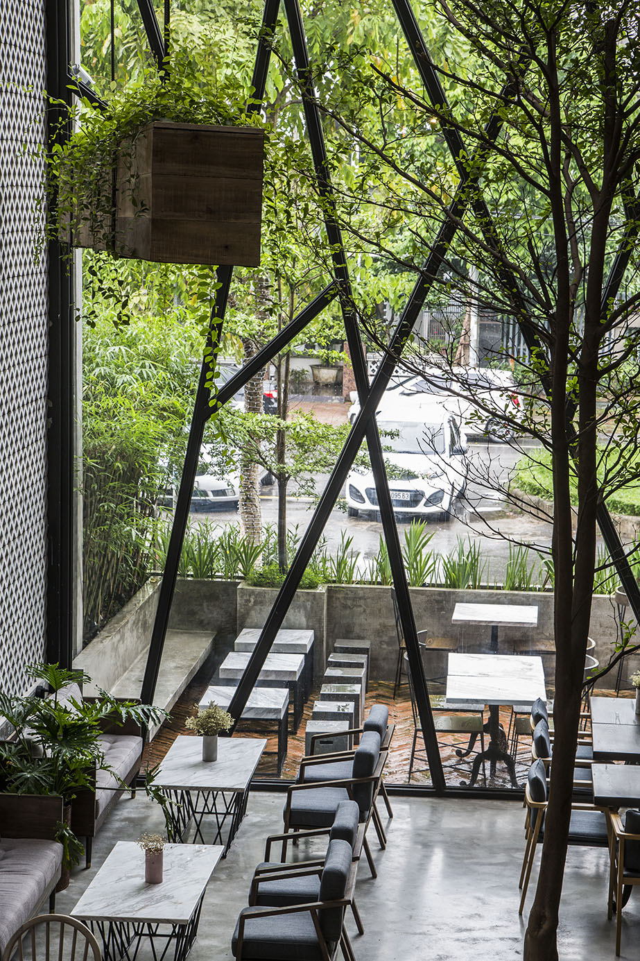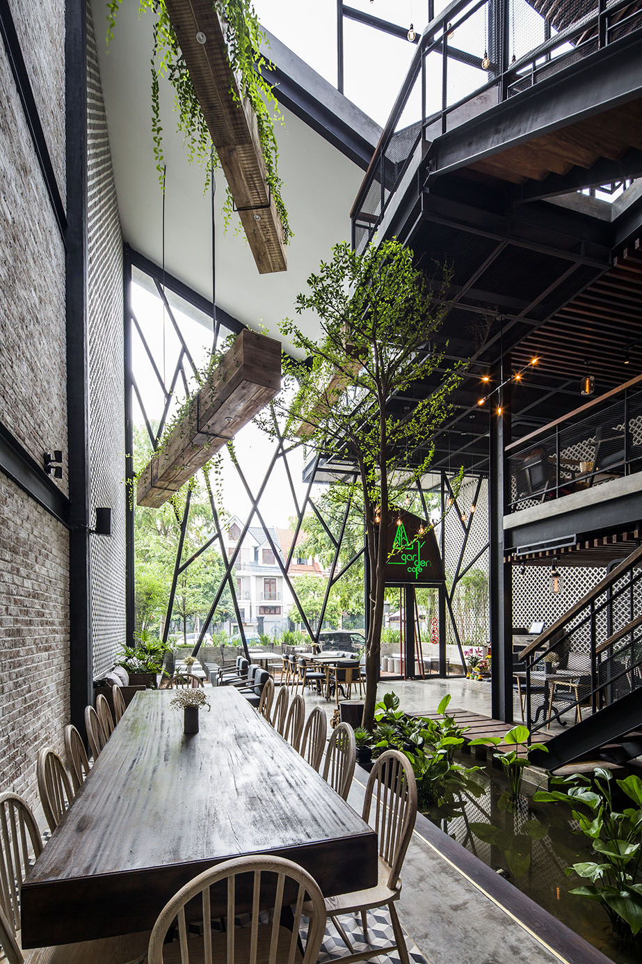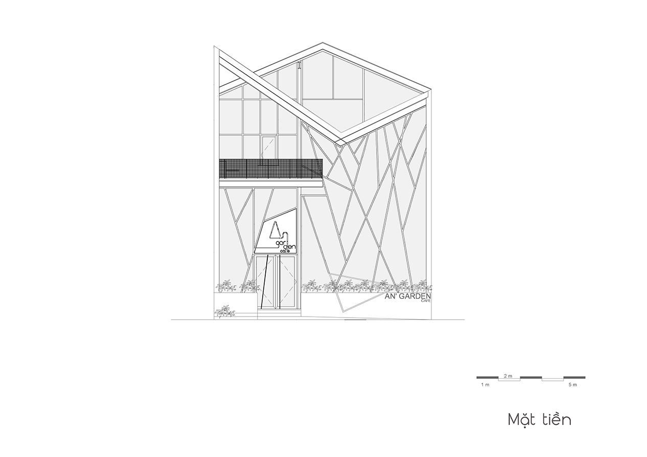 Thoáng nhìn công trình ai cũng đều phải nhanh quay đầu nhìn lại một lần nữa, để những góc cạnh kiến trúc, thể hiện tính nghệ thuật mạnh mẽ in dấu ngay lần ấy. Ngôn ngữ kiến trúc thể hiện được nét cá tính mạnh mẽ, phá cách, góc cạnh với sắc trắng – xám – đen của riêng mình; nhưng cũng nhẹ nhàng hơn với từng nhành lá xanh quấn quít xung quanh. Tuy nhìn bên ngoài có vẻ cầu kỳ nhưng thực chất thời gian thi công tương đối nhanh, không vượt quá khẩu độ công trình. Thể hiện tính công nghiệp nhưng cũng phá cách, vượt trội hơn hẳn so với các nguyên tắc thiết kế không gian quán café truyền thống, dễ dàng tìm thấy trên mọi nẻo đường Việt Nam. Chọn một hướng đi riêng để khác biệt là điều mà An’garden Cafe hướng đến. Chỉ khi nhớ đến An’garden Cafe thì mới nhớ đến không gian đậm chất công nghiệp, một chút nét thô trần nhưng đầy nghệ thuật, không gian thông tầng cao vợi cho những suy nghĩ thoát ra khỏi những nguyên lý chật chội mà ai cũng có thể nghĩ đến. Màu sắc không gian của quán được đồng bộ từ màu trắng xám tự nhiên của xi măng kết hợp với màu gỗ tự nhiên mang sắc café ấm áp, đến điểm nhấn màu đen trên từng khung thép của quán.
