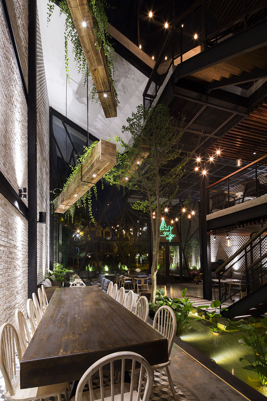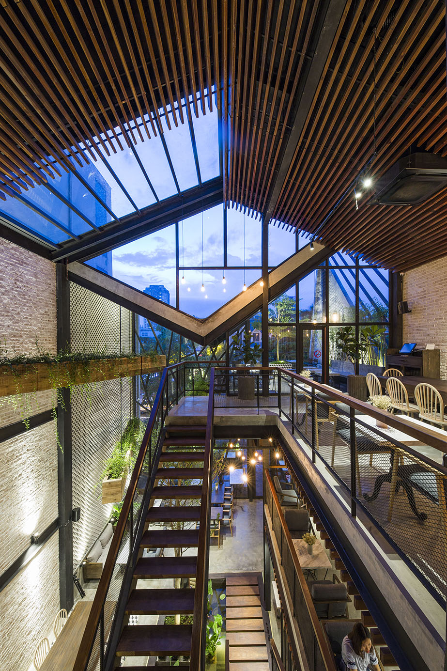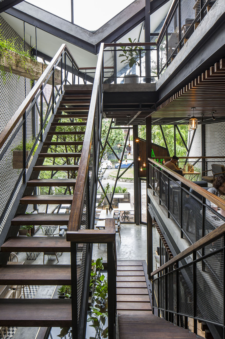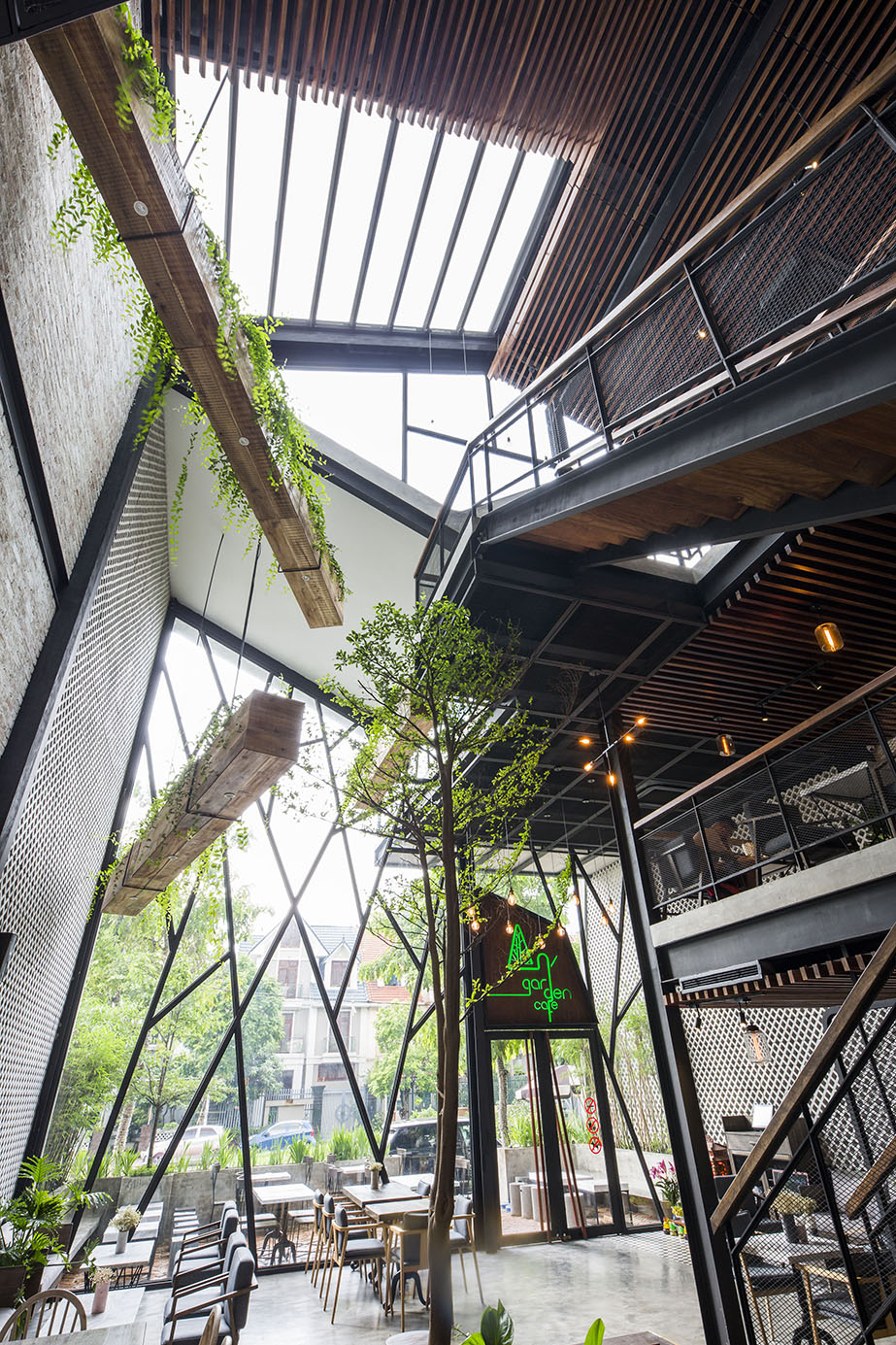 Vườn treo An’garden Cafe – Hơn cả không gian độc đáo, đây là món quà vô giá người chồng tặng vợ mình. Nói đến một ngôi nhà đầy khung thép thì có vẻ khô khan và nặng nề, nhưng ấn tượng ở An'garden cafe còn đến từ những bồn cây treo lơ lửng như được sắp xếp ngẫu hứng, giống như lạc vào một khu vườn treo thơ mộng vậy. Và thêm một điều khiến công trình này có ý nghĩa đặc biệt bắt nguồn từ chính yêu cầu chủ quán giao cho kiến trúc sư "Anh làm để tặng sinh nhật vợ anh”. An’garden Cafe không chọn cho mình một hướng đi an toàn như bao quán café khác thực hiện mà đã theo đuổi, xây dựng cho mình một không gian độc lạ, để nơi đây không chỉ là nơi hương cà phê thoảng hương mê hoặc mà còn cho những tâm hồn mộng mơ thả hồn trôi theo từng nhành cây, ngọn gió, mây trời.